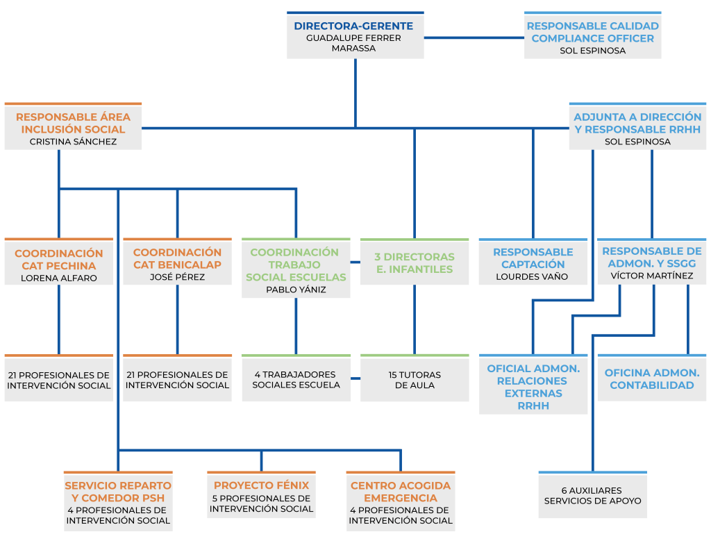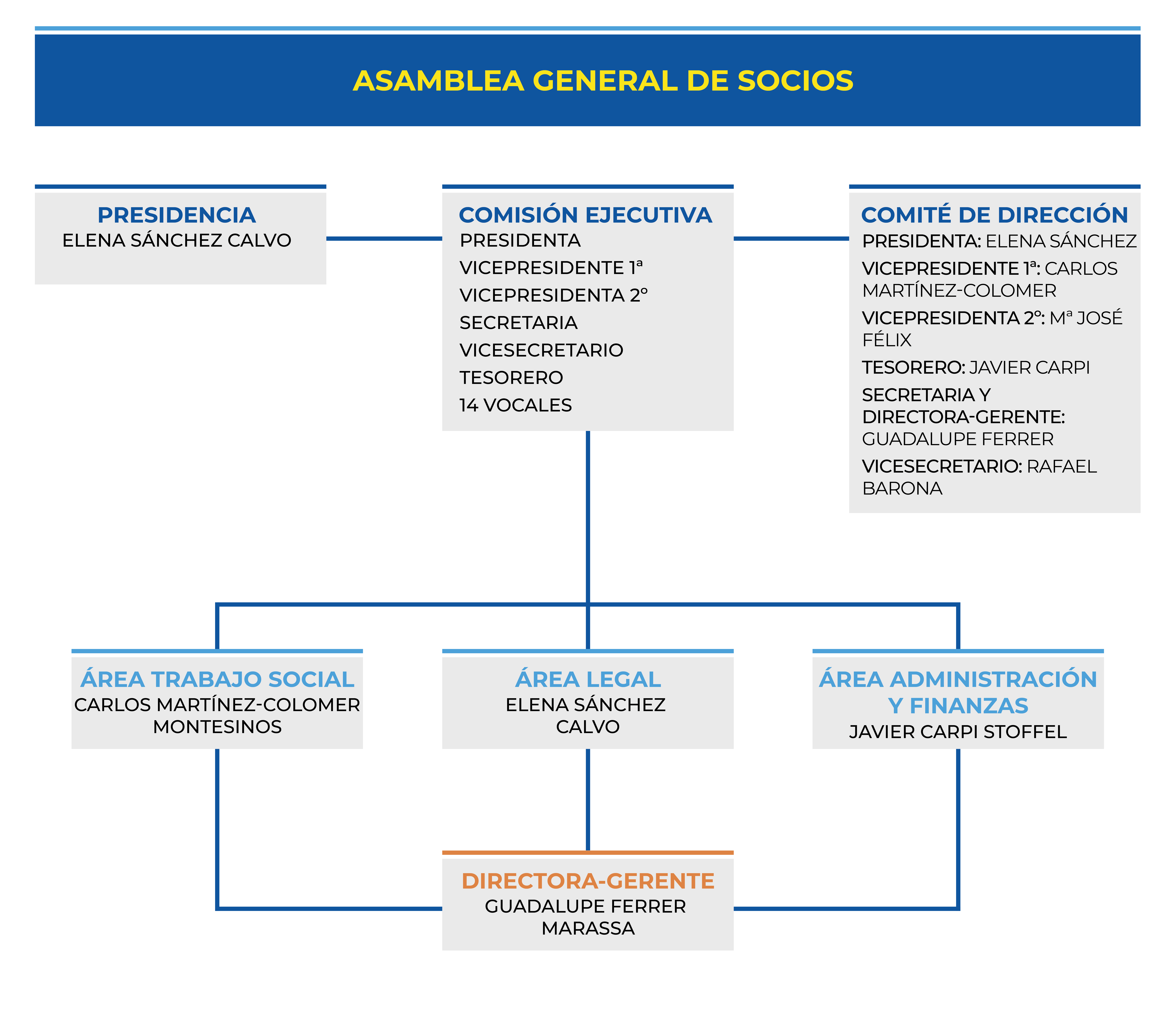 La actual comisión ejecutiva está formada por 20 miembros. Las personas que la conforman lo hacen de manera altruista y desinteresada colaborando en la gestión, dirección y administración de la entidad, representando a Casa Caridad en cualquier ámbito y sensibilizando a la sociedad de su función social.