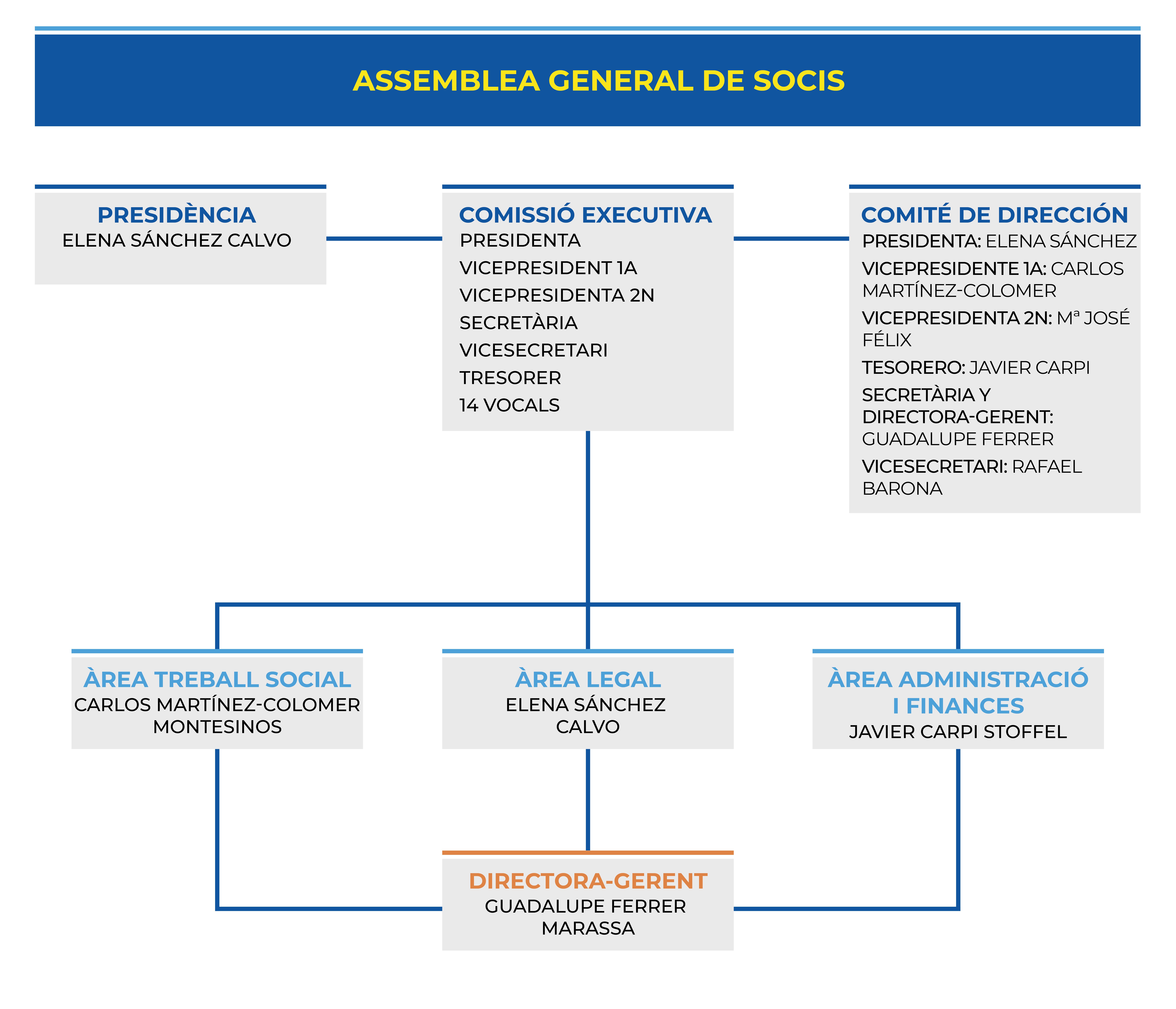 L’actual comissió executiva està formada per 20 membres. Les persones que la conformen ho fan de manera altruista i desinteressada col·laborant en la gestió, direcció i administració de l’entitat, representant a Casa Caridad en qualsevol àmbit i sensibilitzant a la societat de la seua funció social.